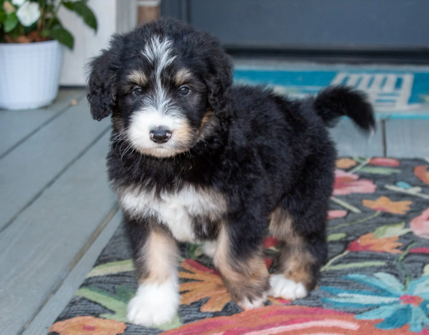 Cary Grant has the traditional tri-color markings and he will be even more handsome as his Bernedoodle coat develops and becomes wavy. He’s 7 weeks of age in these pics. As his coat grows and becomes wavy (you can see the waves starting around his ears and head), his colors will contrast and pop and he will be a stunner!